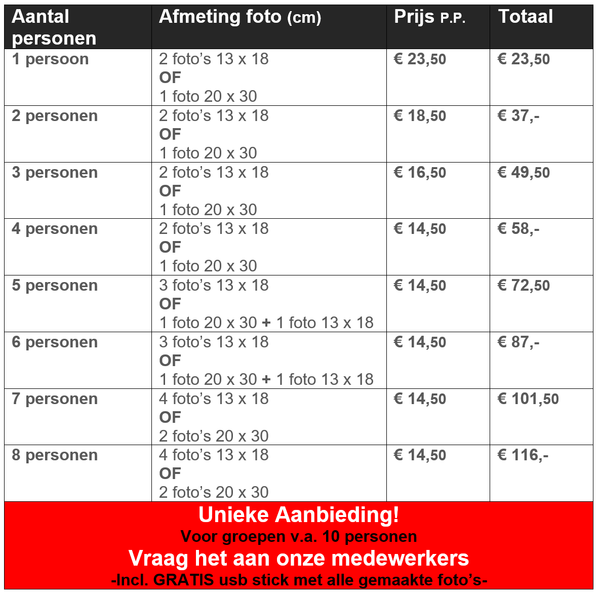 Prijslijst Fotograaf Zwarthoed